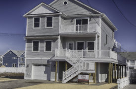 This custom modular home is located within steps from the beach. The house is raised on pilings to conform to the latest flood zone requirements.